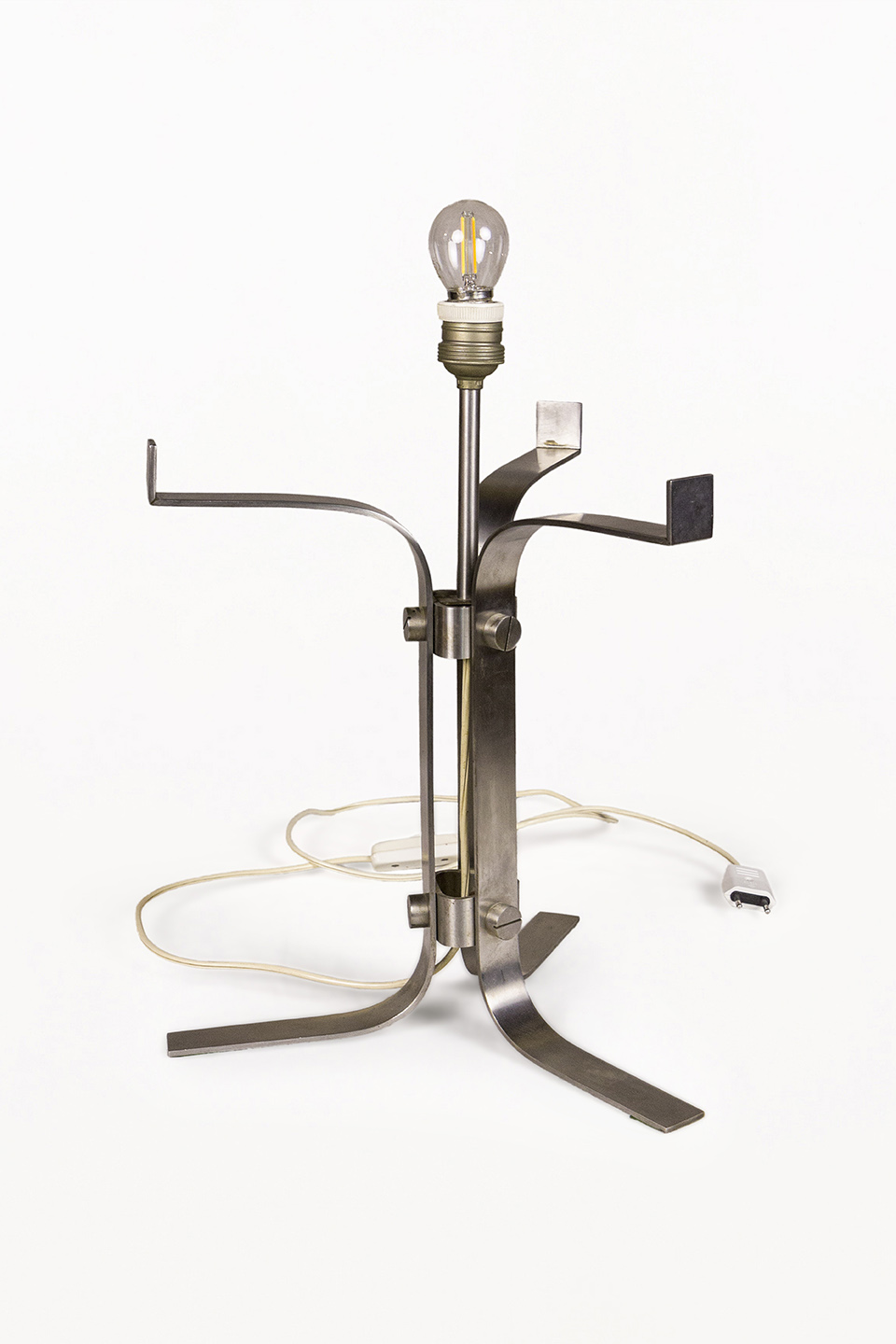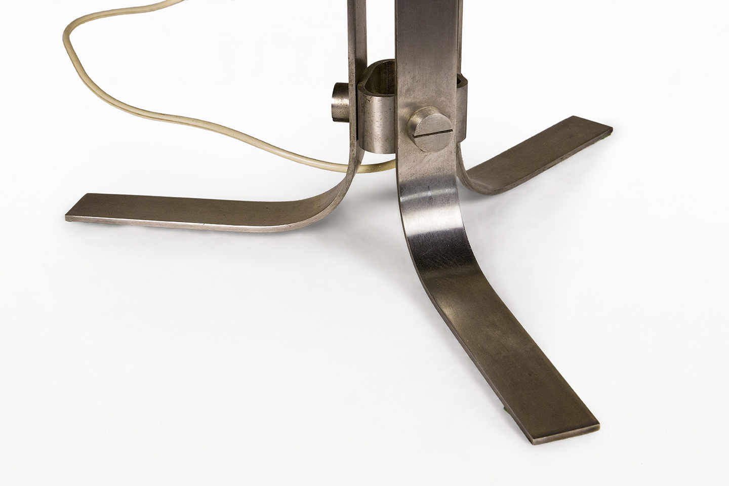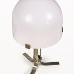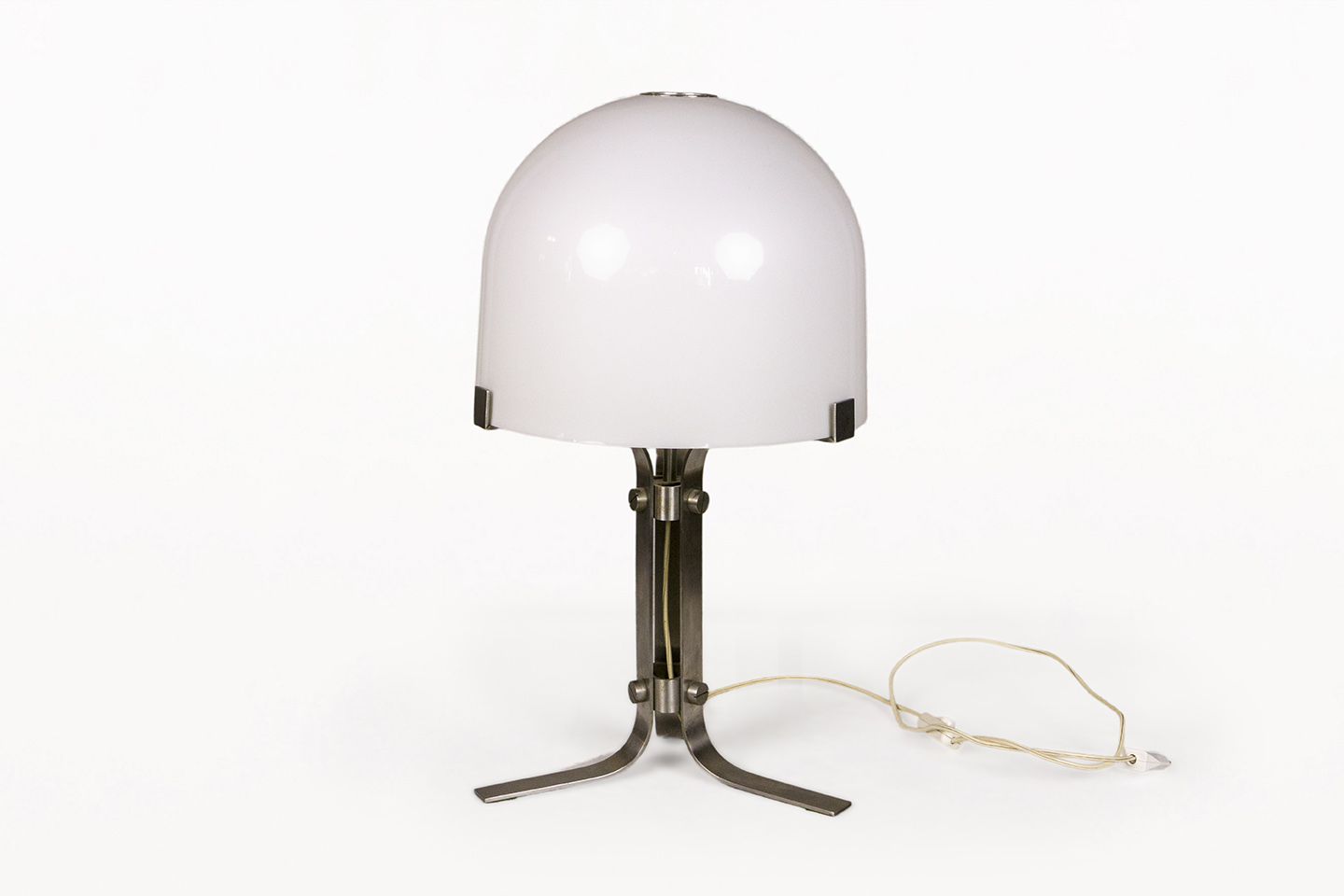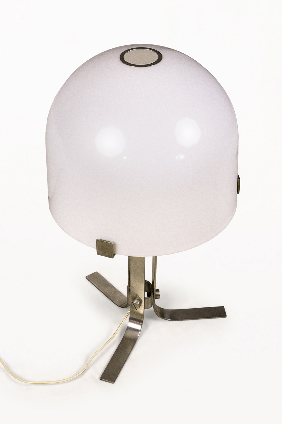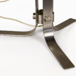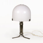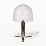 DESCRIPTION: Chrome Table Lamp by Jordi Vilanova i Bosch, Circa 1960, Spain. Interpretation of Vilanova’s “Anella” design. Three curved steel legs, creating the base that holds a circular white lucite lampshade.