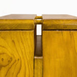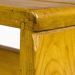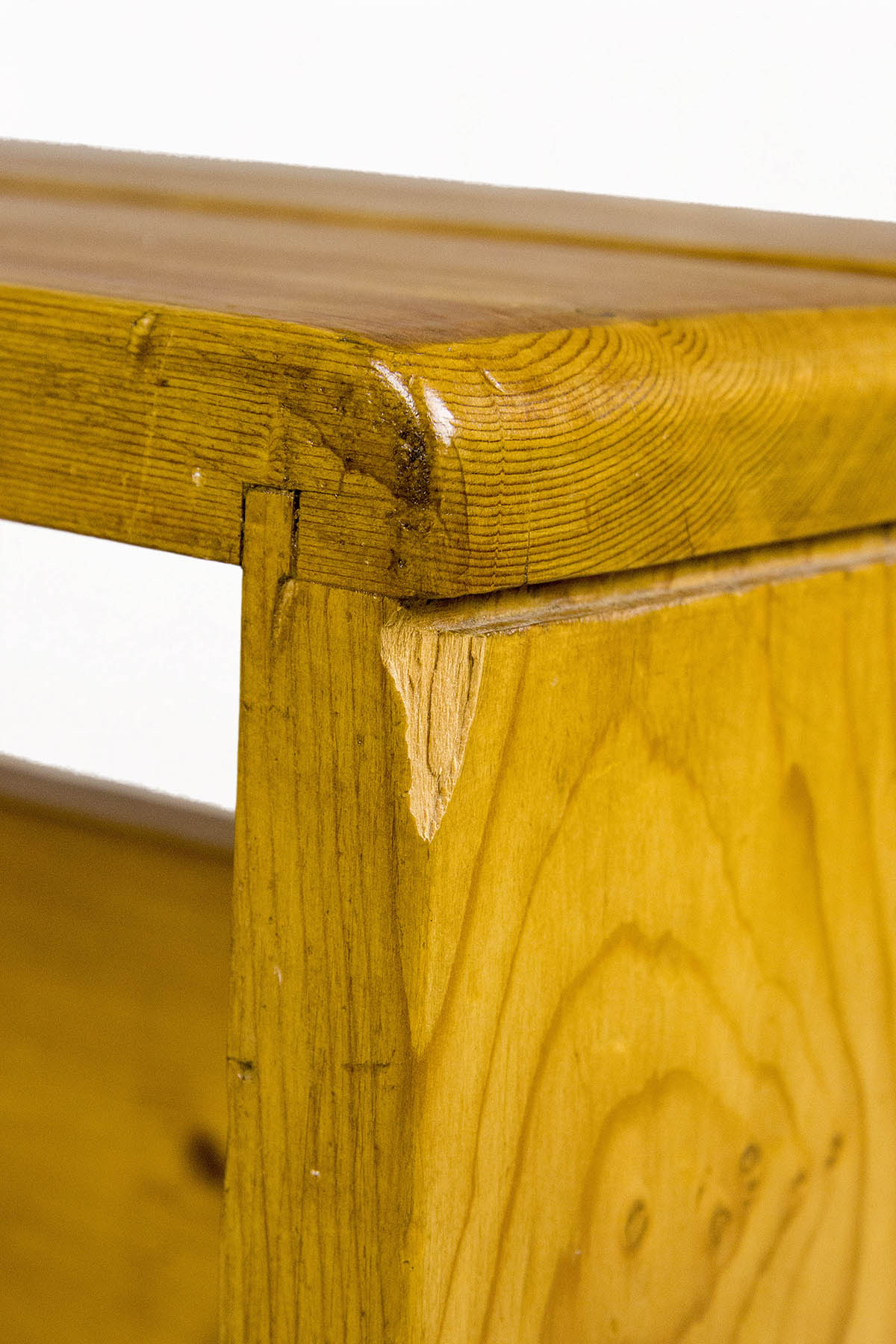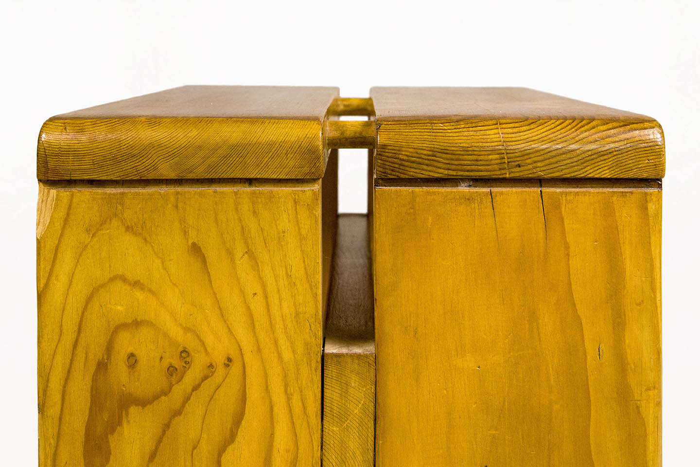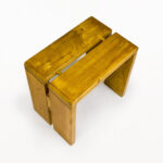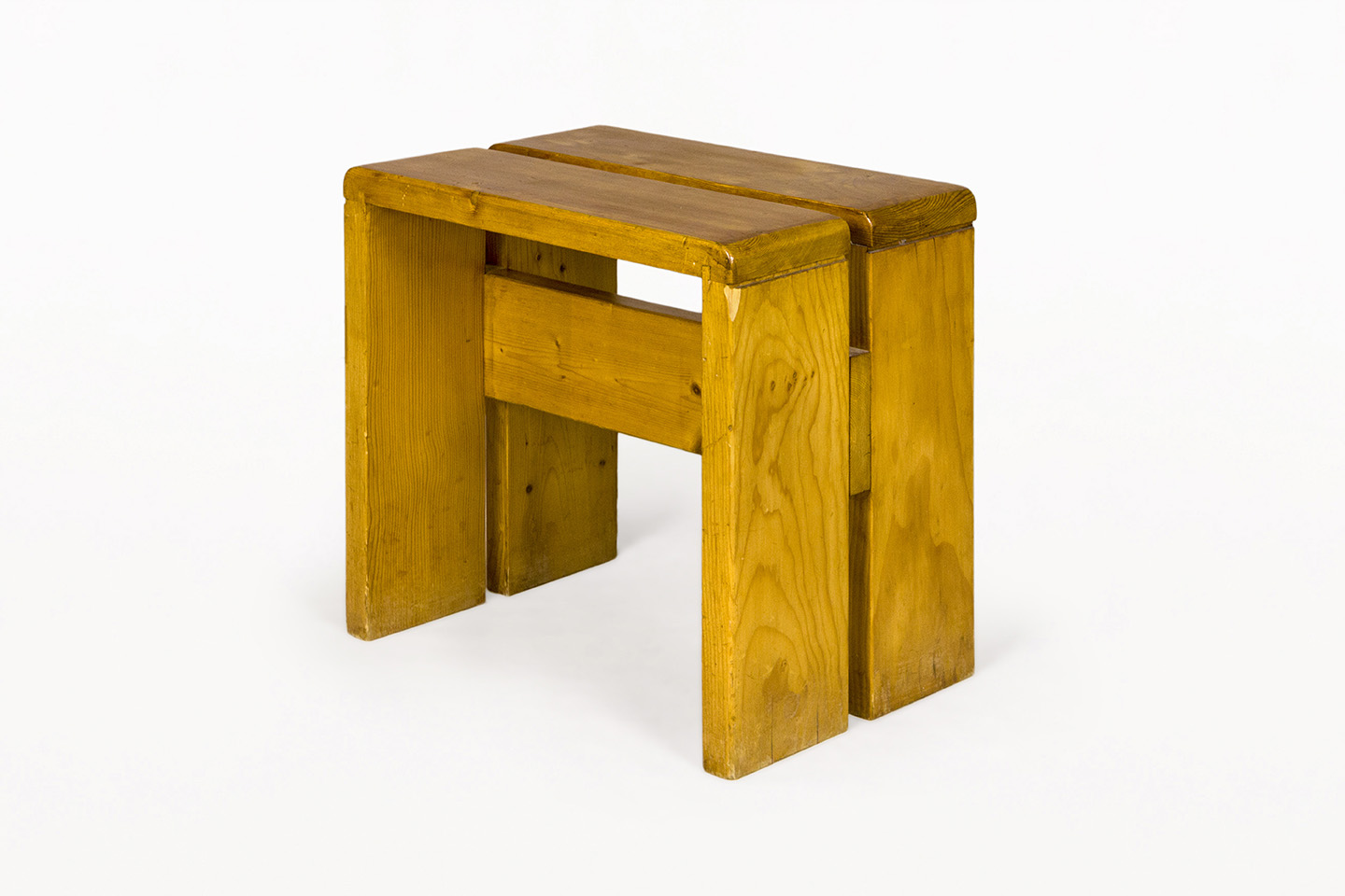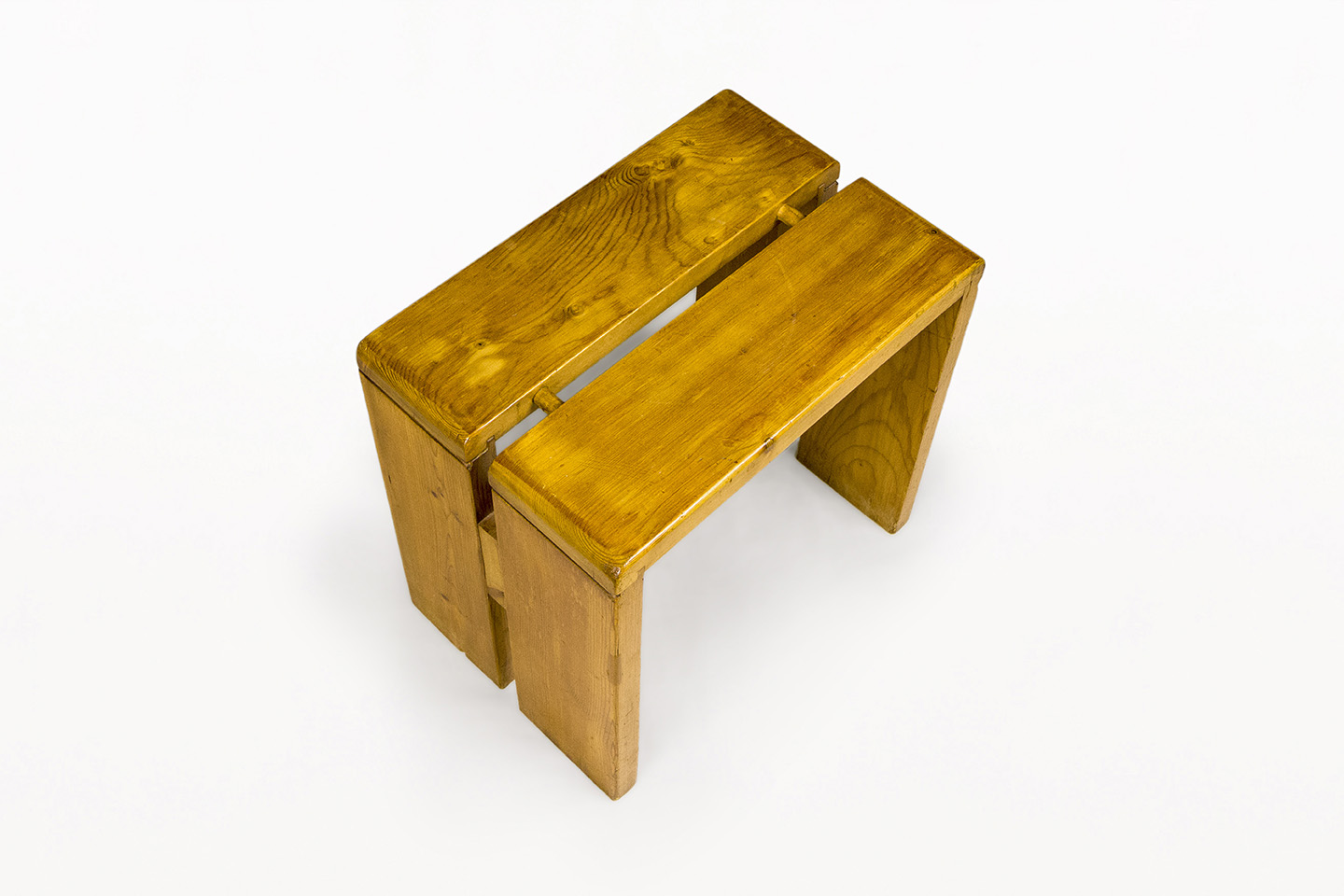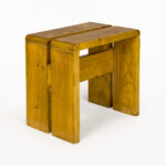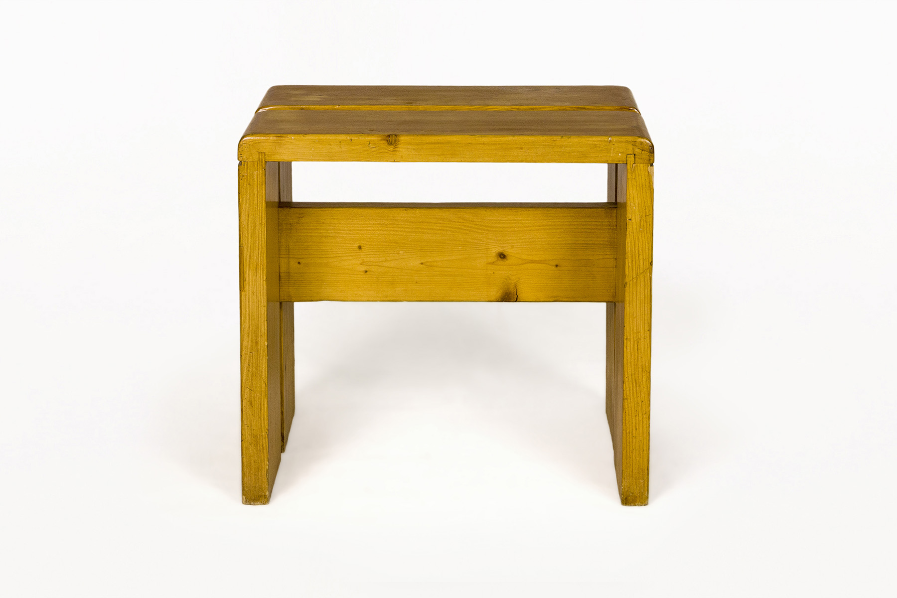 DESCRIPTION: Les Arcs Pine Wood Stool by Charlotte Perriand, Circa 1960, France. This object is a Les Arcs pine stool, designed by the renowned French architect and designer Charlotte Perriand. The stool was designed for the Les Arcs ski resort in the French Alps, a project Perriand dedicated 20 years to between 1967 and 1989. It is crafted from solid pine wood, which was chosen to fit the rustic mountain aesthetic of the resort. The piece is a classic example of Mid-Century Modern and minimalist design, featuring a sturdy “inverted U” silhouette